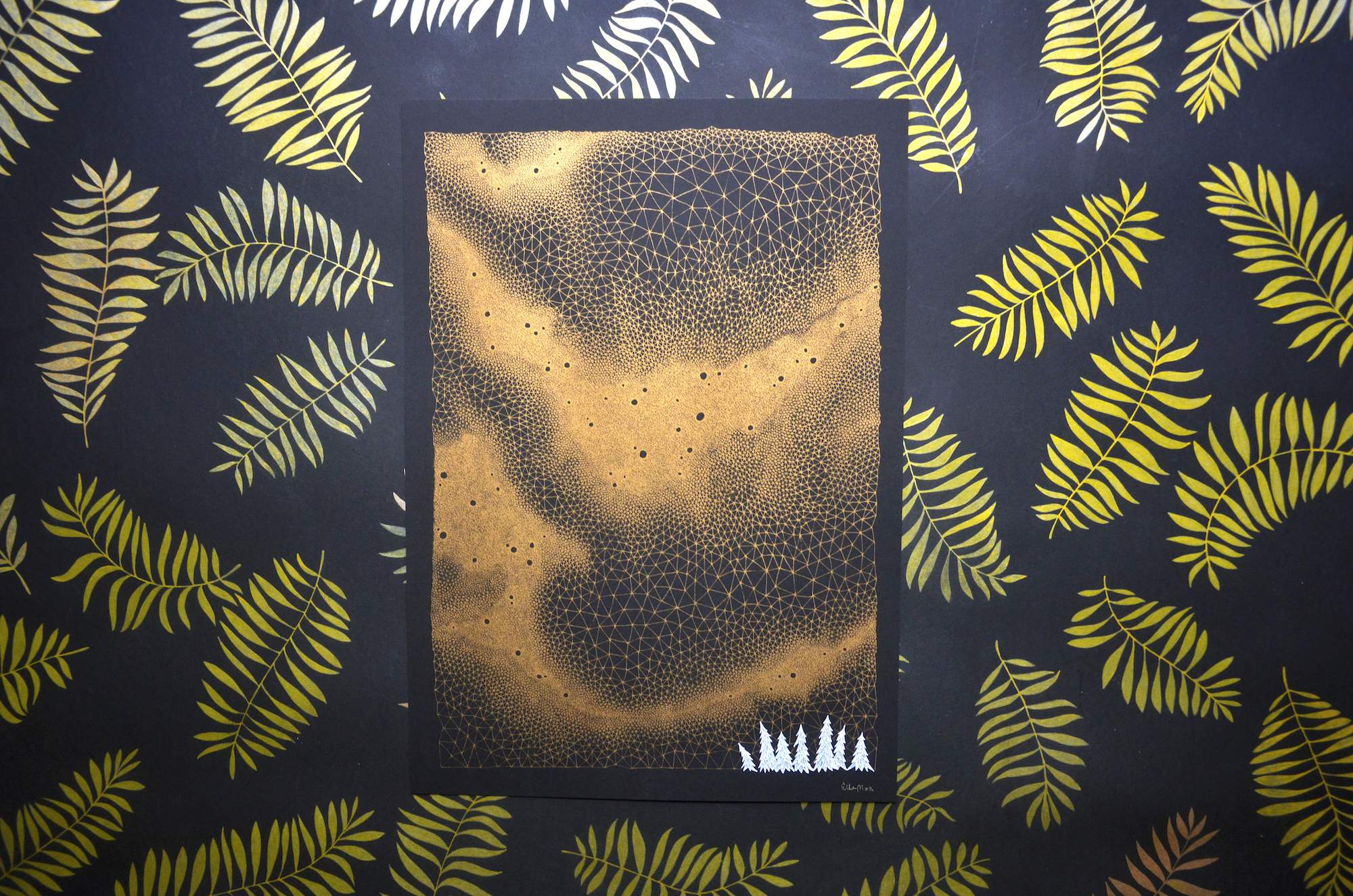 Illustration for my then print shop. Drawn by hand and Risograph printed in metalic gold on black with hand drawn details in white, 2016.