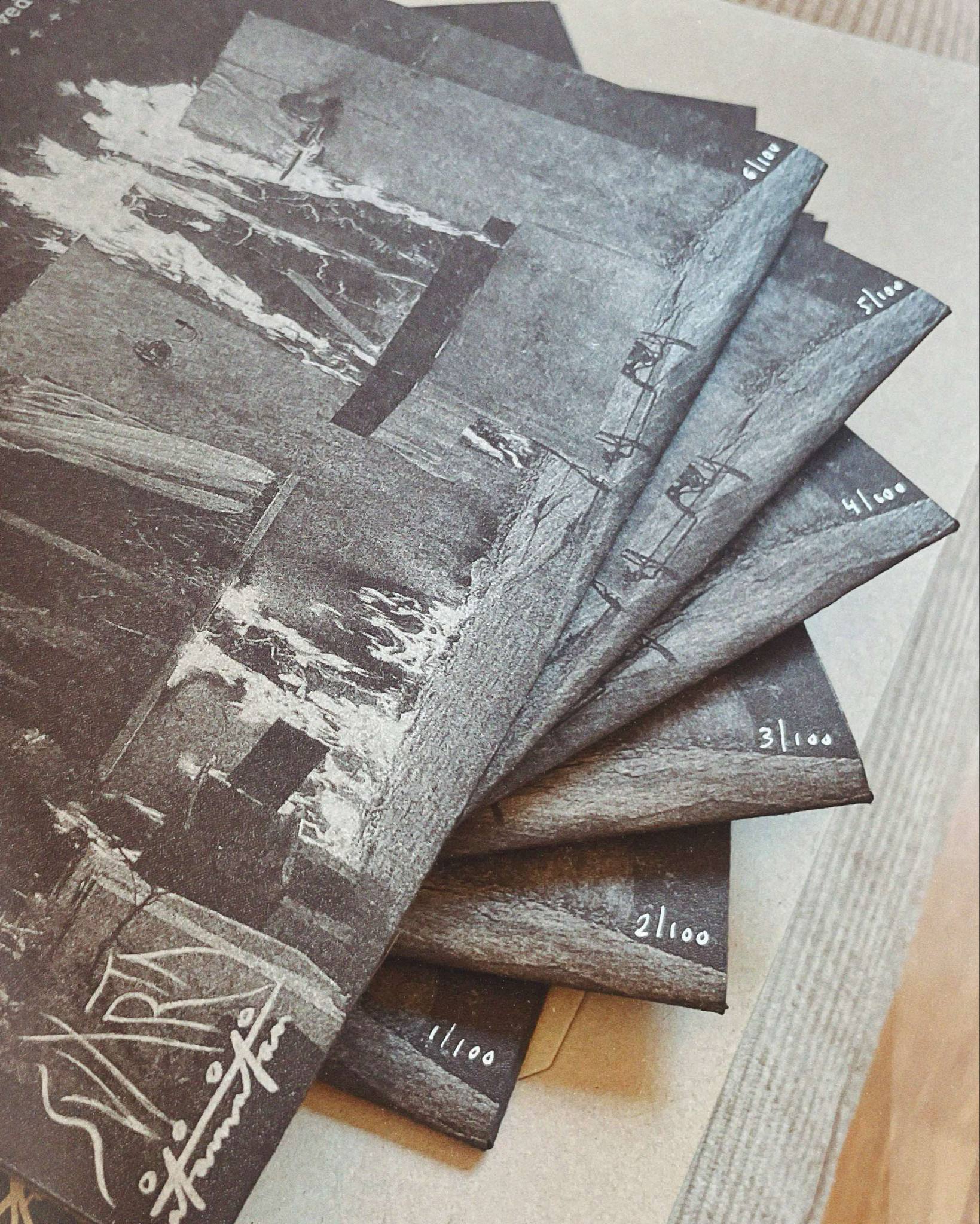 Silver on black Risograph printed hand cut and folded sleeves. All labels are hand lettered. A limited numbered edition of 100 copies.